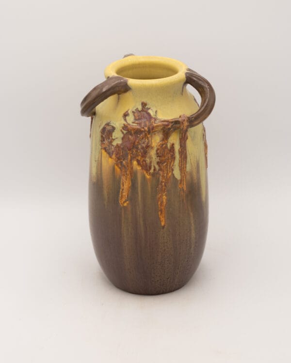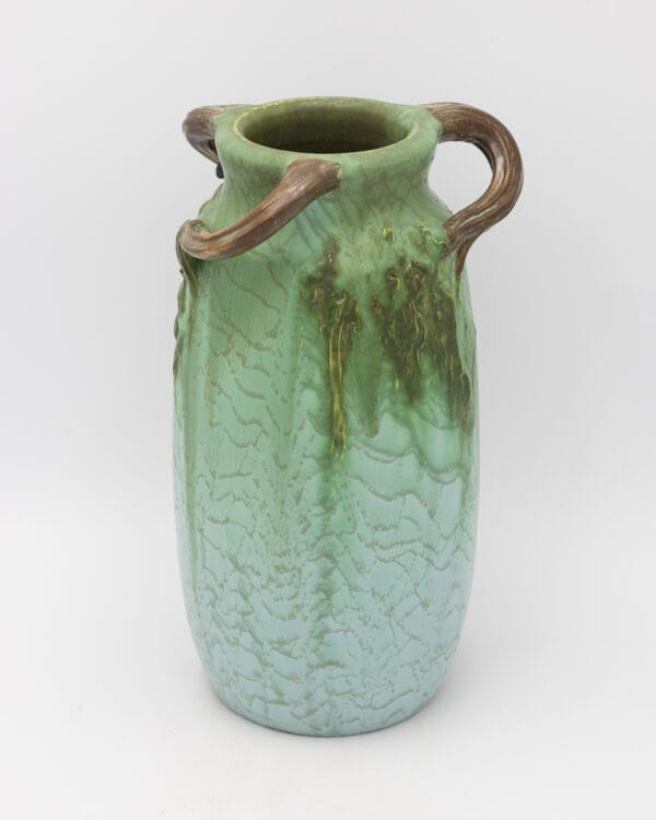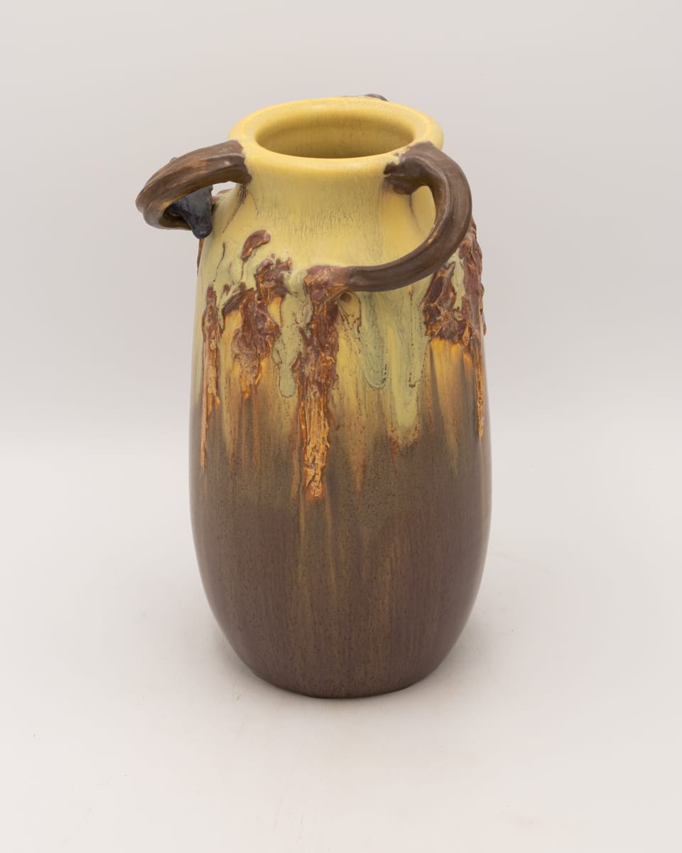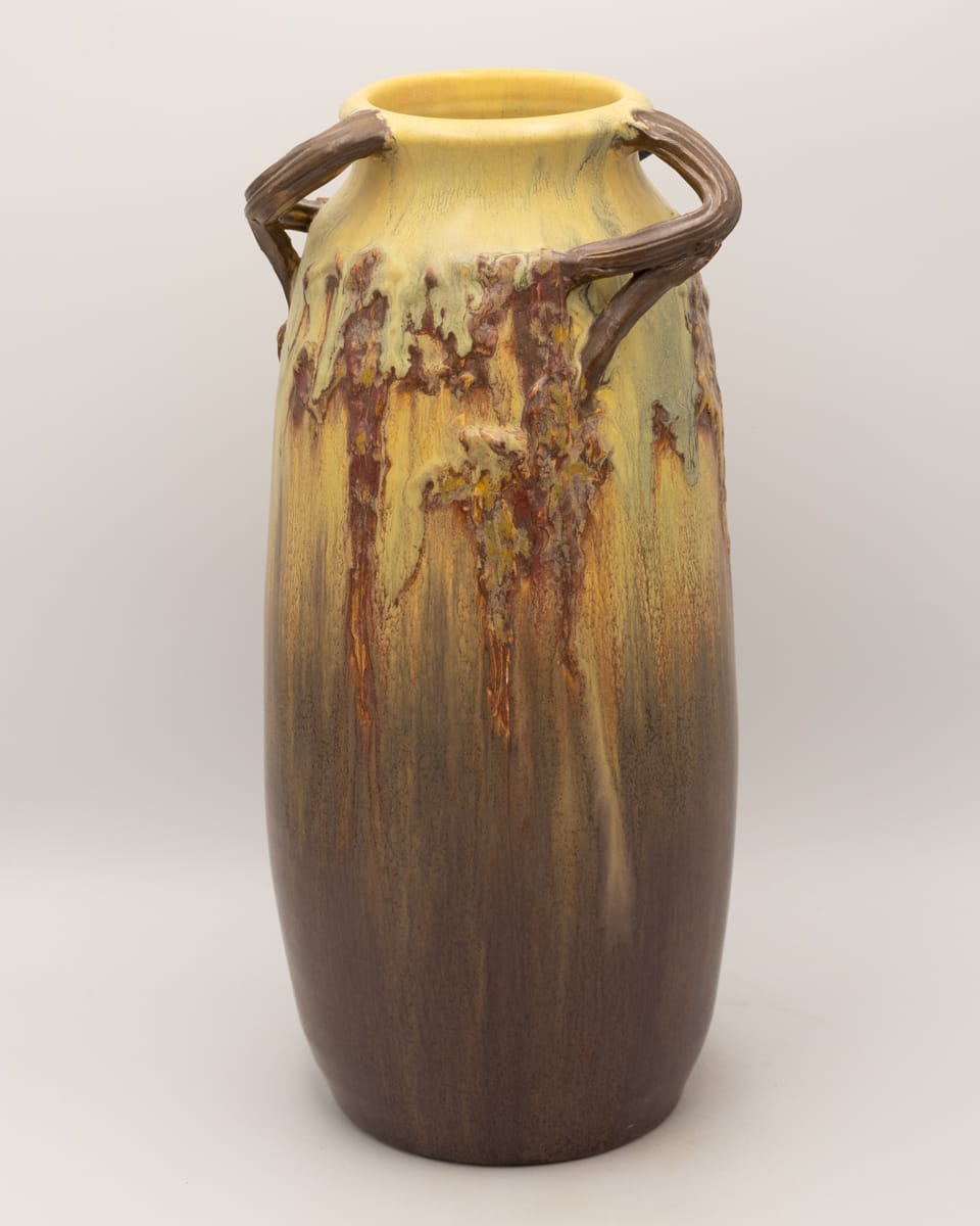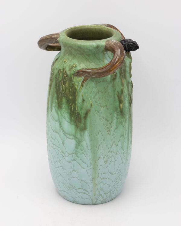 A lone crow poses on one of three branch handles, overlooking a moody and mysterious vista, framed by draping lichen. This piece was inspired by Ephraim artists’ trip to the West Coast, where soaring Monterey pine trees with lichen—so different from fir trees here in Wisconsin—fascinated them. The Lookout Vase is offered in two sizes and two glaze options.