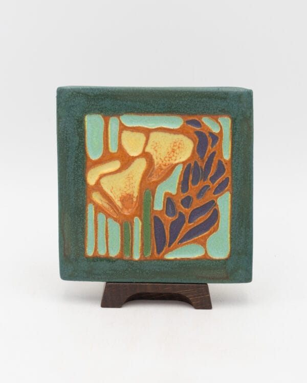 Fields of poppy and lupine flowers bloom across California meadows from late February to April, their beautiful blossoms carpeting the valleys between mountains and hills to form iconic and stunning vistas. This regal tile features these two flowers rendered in rich and vibrant glaze colors, bordered by oceanic teal.