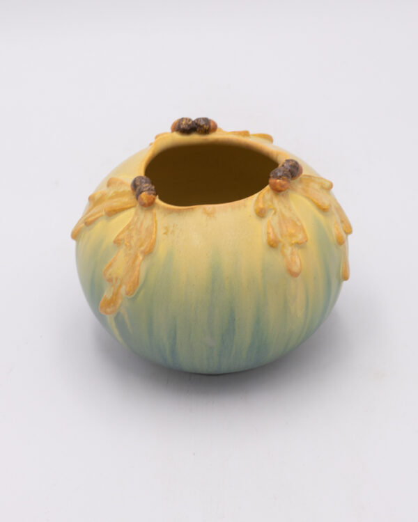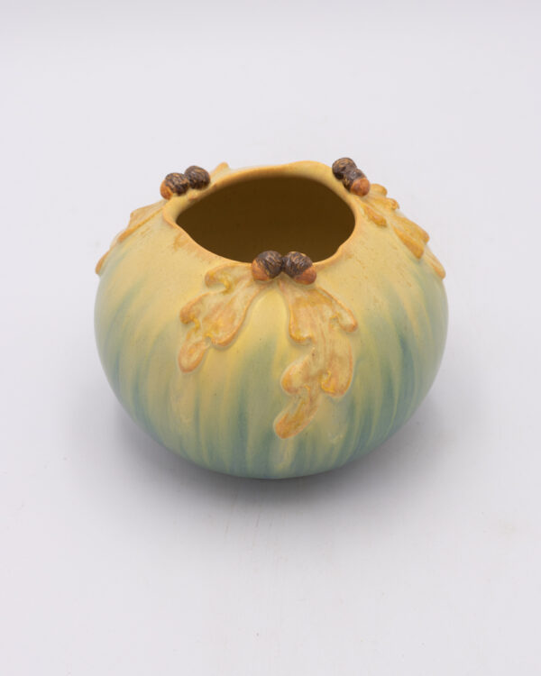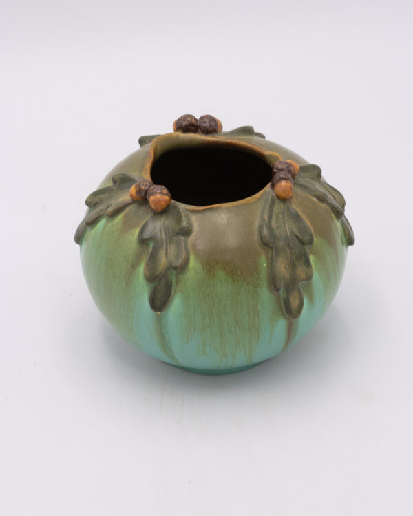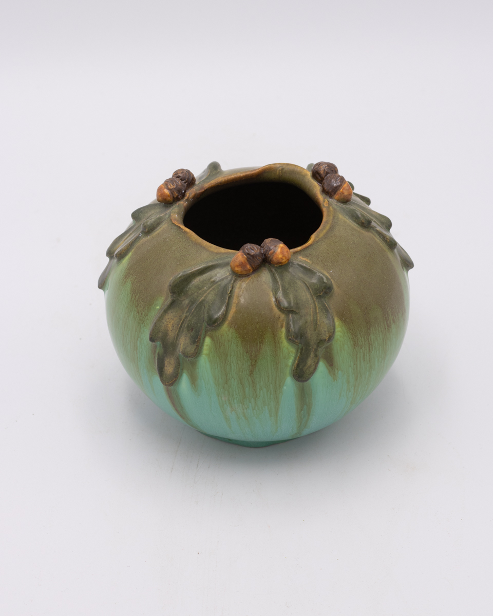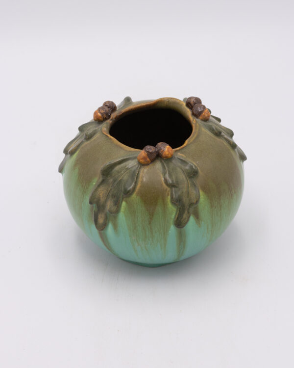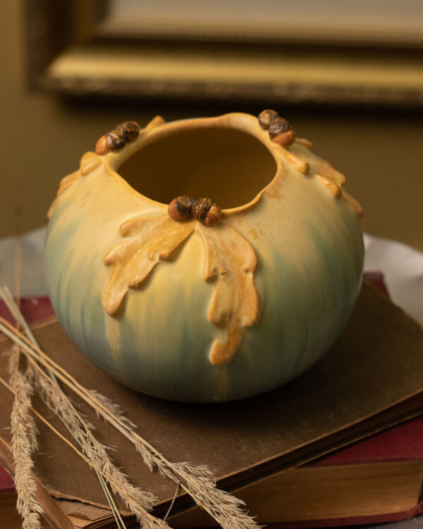 Three pairs of oak leaves and acorns crown the rim of the irresistible Whispering Oak Bowl. A gently manipulated rim, lively hand-sculpture, and dynamic glazes lend this piece considerable grace and movement.