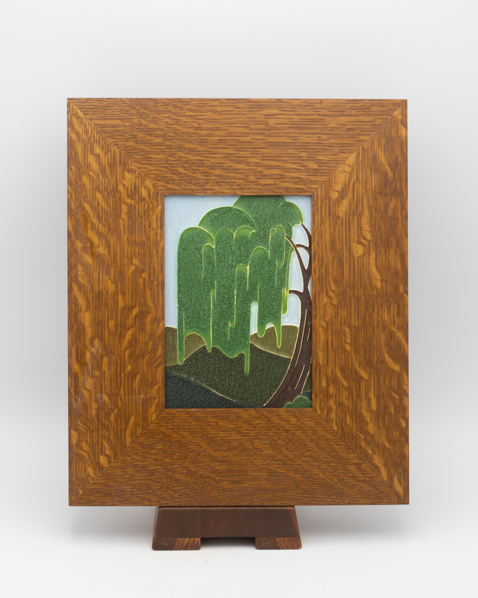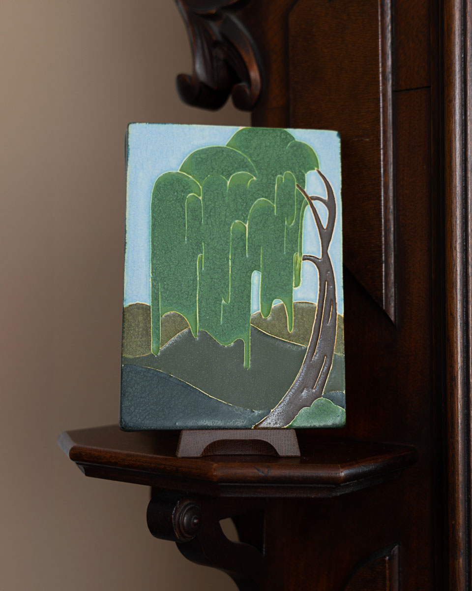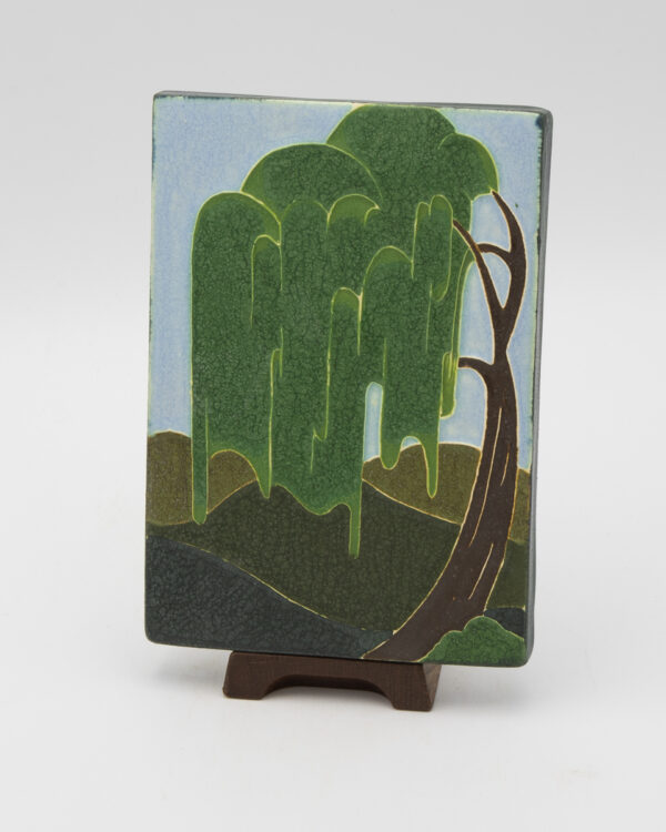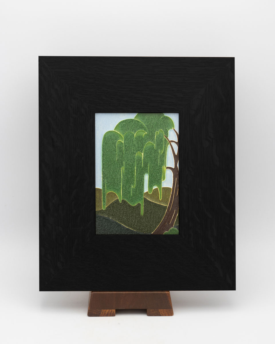 A weeping willow dances against a bright blue sky, its flowing branches creating a rhythmic pattern across this decorative tile. The layered glazes transition from deep earth tones to bright spring green, capturing the gentle movement of leaves in a spring breeze.