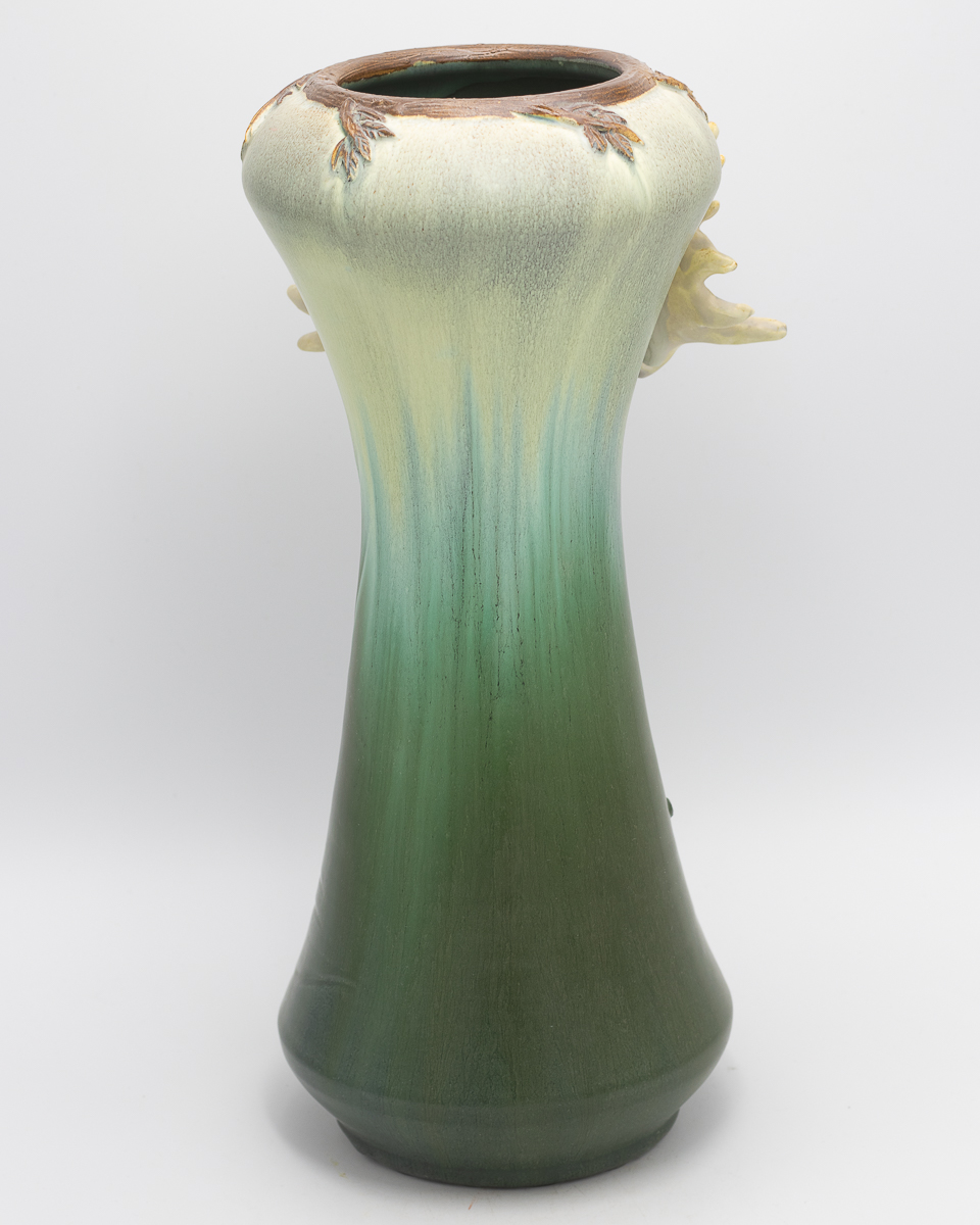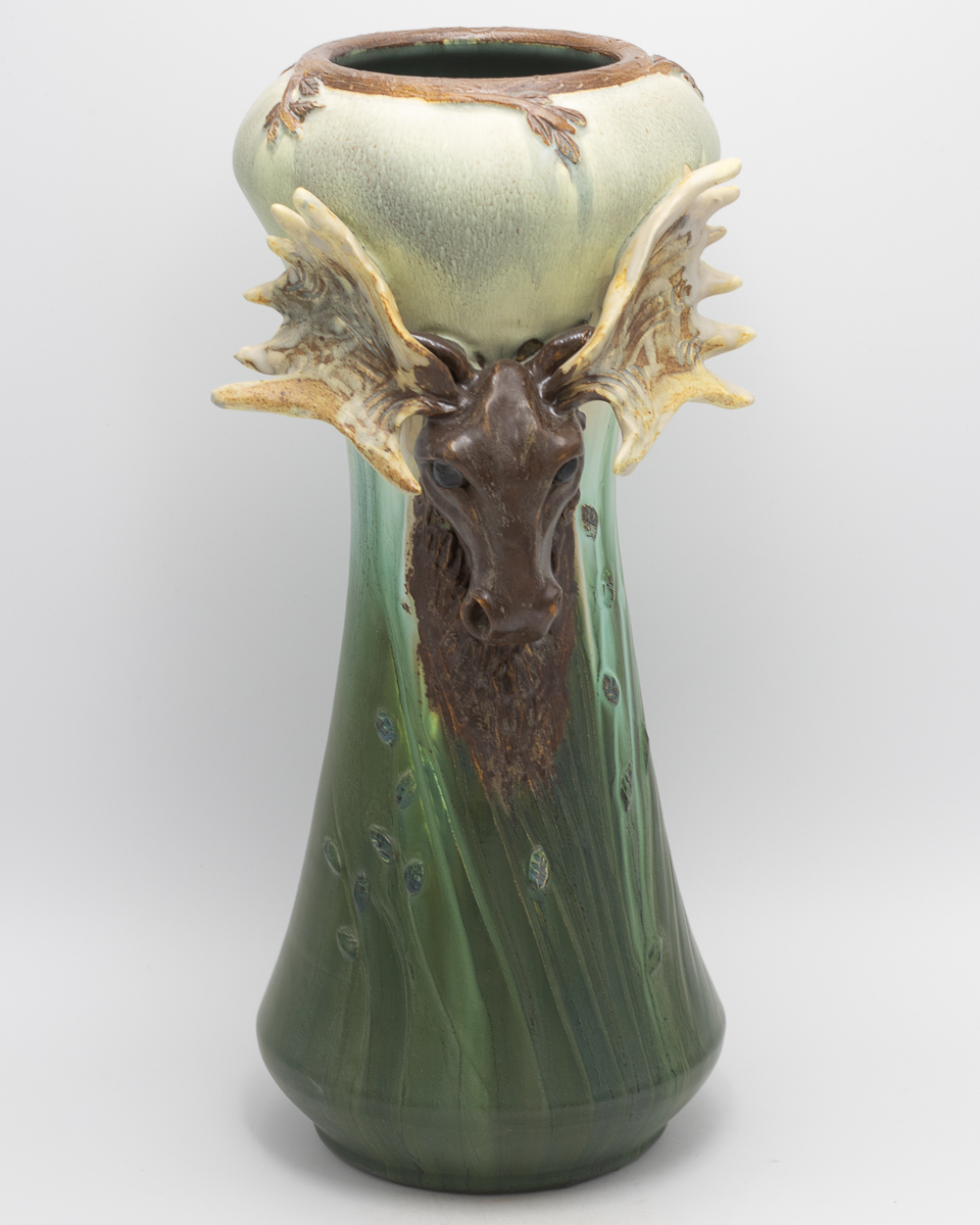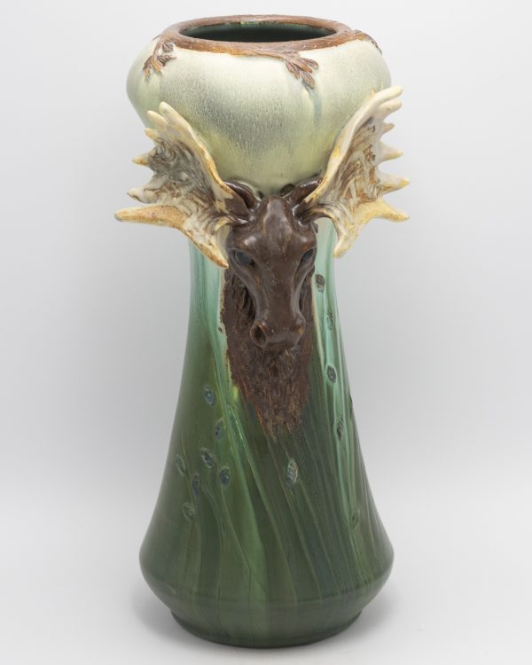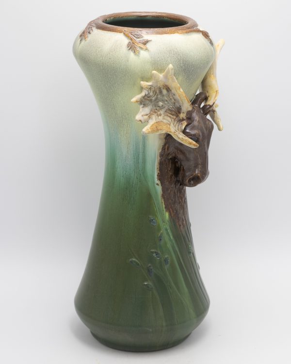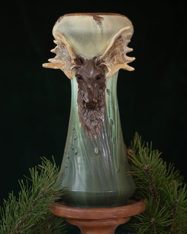 The Winter Majesty Vase captures the raw, wild beauty of winter’s northern landscape. This unusual form features an extraordinary sculptural element—a fully dimensional moose emerging from the vase’s upper half, its impressive antlers and textured details rendered in meticulous craftsmanship. The dramatic color palette shifts from pale grey at the rim through sage green to deep forest tones at the base, while the moose itself displays rich earth and amber glazes that seem to glow with inner warmth. This one-of-a-kind statement piece honors the majestic creatures that roam the winter woods, bringing a sense of wilderness and wonder to your home.