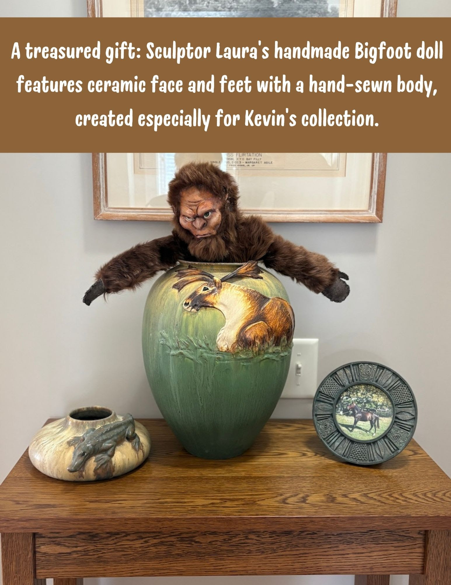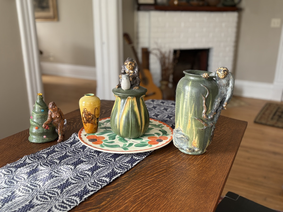 What began as nostalgic inspiration has evolved into a cherished private collection. As you can see in these rare glimpses into Kevin’s personal space, our artists have created special Bigfoot-themed pottery pieces as birthday and Christmas gifts for him over the years. Each piece represents not just artistic skill, but the camaraderie and shared creative spirit that makes Ephraim Pottery special.